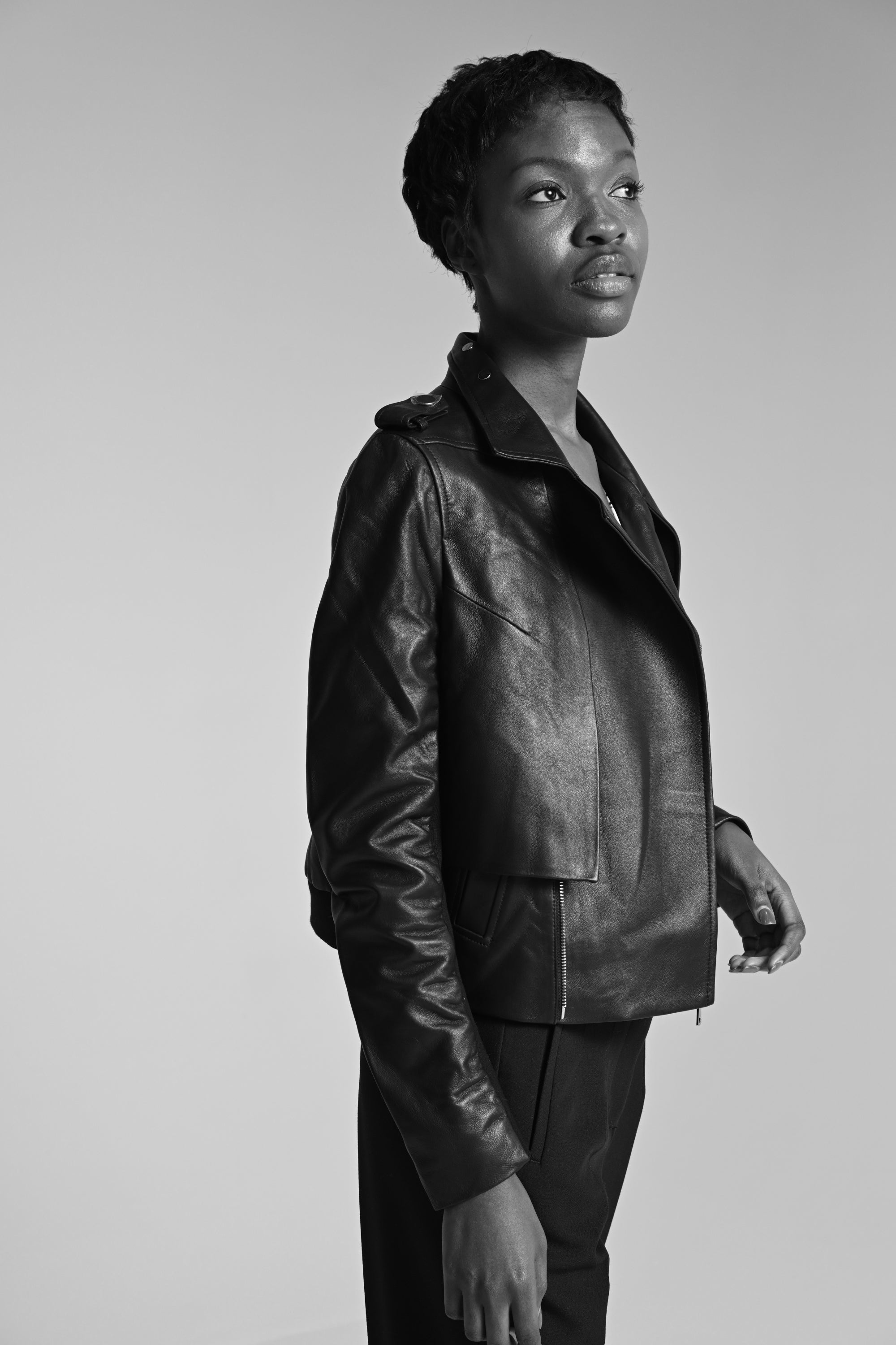 The Amelia jacket combines classic trench coat tailoring with a biker jacket. Stretch jersey sleeve inserts enhance the style and the comfort. Further finishing touches include epaulets, trench coat flaps on the front and a bomber jacket hem detail in the back.